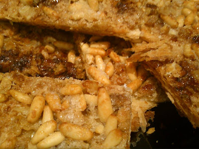 pintamos con el huevo,el chicharrón lo cortaremos a trocitos le pondremos un poco de azúcar y los extendemos por toda la masa,aplastamos con las manos para que quede apretado,los piñones los habremos
